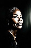 Dieses eindrucksvolle Porträt zeigt eine elegante ältere Schwarze Frau in dunkler Kleidung und stilvollem Schmuck, die in weiches Licht gehüllt vor einem dunklen Hintergrund sitzt. Der subtile Lichteinfall betont ihre Gesichtszüge auf eine zarte, aber kraftvolle Weise und hebt die Tiefe ihrer Ausstrahlung hervor.