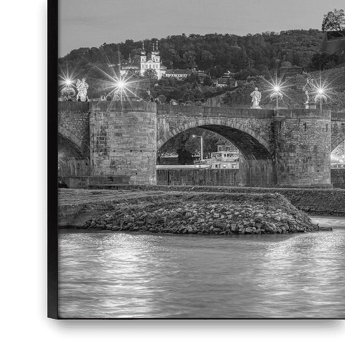 Blick vom Mainufer in Richtung Alte Mainbrücke und Festung Marienberg an einem Abend im Spätsommer.