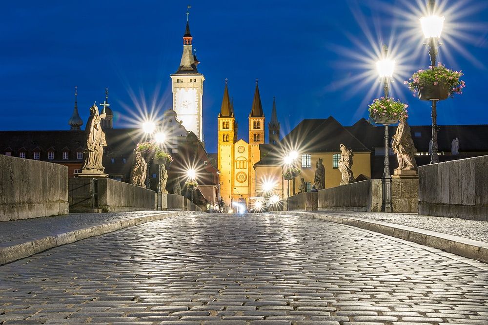 Der Blick über die Alte Mainbrücke in Würzburg zum Rathaus und Würzburger Dom am Abend