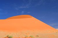 Rote Sanddünenlandschaft in der Wüste von Sossusvlei in Namibia mit blauem Himmel.