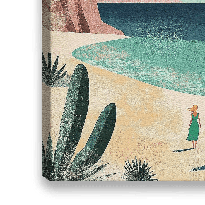 Eine ruhige und minimalistische Landschaft, in der Wüste und Meer unter einer imposanten roten Sonne aufeinandertreffen. Das türkisfarbene Meer, rosafarbene Felswände und einsame Kakteen sorgen für eine verträumte Atmosphäre, während eine kleine Figur in einem grünen Kleid die immense Größe der Landschaft unterstreicht. Das Kunstwerk…