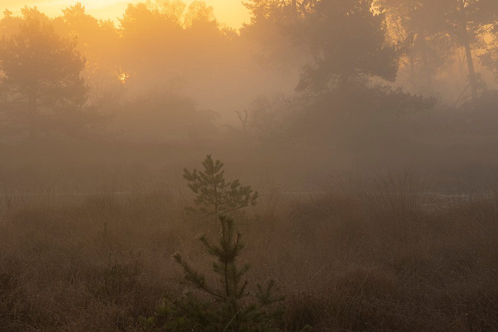 Wunderschöner nebliger Morgen mit einem schönen Sonnenaufgang auf der Kampina.