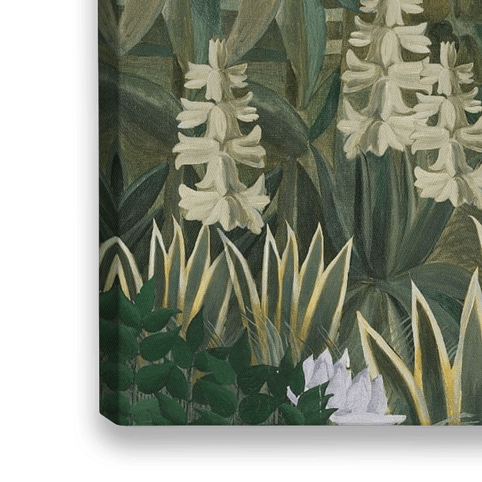Wunderschönes botanisches Bild des Dschungels mit Farnen und Blumen. Wunderschön gemalte Details in leuchtenden Farben. Geeignet als Tapete, Panorama im Haus oder nehmen Sie ein Detail und machen Sie Ihre eigene Leinwand. Dies kann in jedem Interieur gefunden werden, sei es bohemianisch, eklektisch, klassisch oder modern. Diese Arbeit…