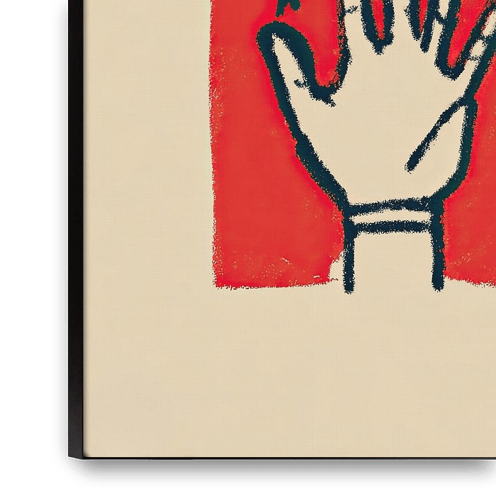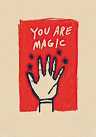 Diese minimalistische Illustration auf cremefarbenem Grund zeigt ein zentrales rotes Rechteck mit einer markanten, unregelmäßigen Struktur. Darin befindet sich der weiße Schriftzug „YOU ARE MAGIC“ in Großbuchstaben. Über dem Text sind drei kleine schwarze Sterne platziert. Unterhalb des Schriftfeldes ist eine weiße Hand mit schwarzen…