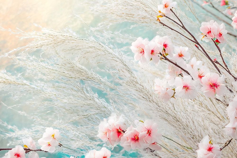 Dieses wunderschöne Bild fängt die Essenz natürlicher Eleganz mit zarten rosa Blumen und sanften weißen Gräsern vor einem ruhigen blauen Hintergrund ein. Perfekt, um in jedem Raum eine ruhige und einladende Atmosphäre zu schaffen. Verleihen Sie Ihrem Interieur einen Hauch von Romantik mit diesem charmanten Kunstwerk, das zu einer Vielzahl von Stilen passt, von klassisch bis modern. Ideal für Wohn-, Schlaf- oder Esszimmer, strahlt dieses Design Raffinesse und Ruhe aus. Lassen Sie die Schönheit der Natur Ihr Zuhause verschönern.