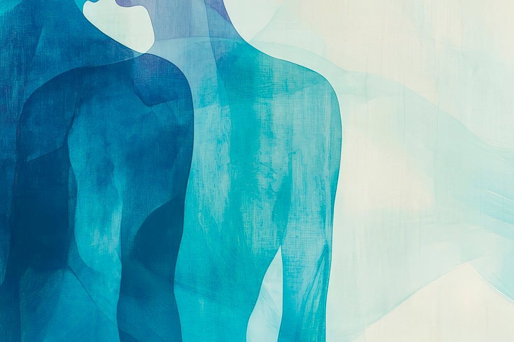 Zarte Silhouetten verschmelzen harmonisch in sanften Blau- und Lilatönen, als ob sie in einer emotionalen Umarmung gefangen sind. Diese fließenden Formen erzeugen eine beruhigende Atmosphäre und laden ein, Nähe und Geborgenheit zu spüren. Perfekt für das Schlafzimmer, wo Intimität und Stil Hand in Hand gehen.