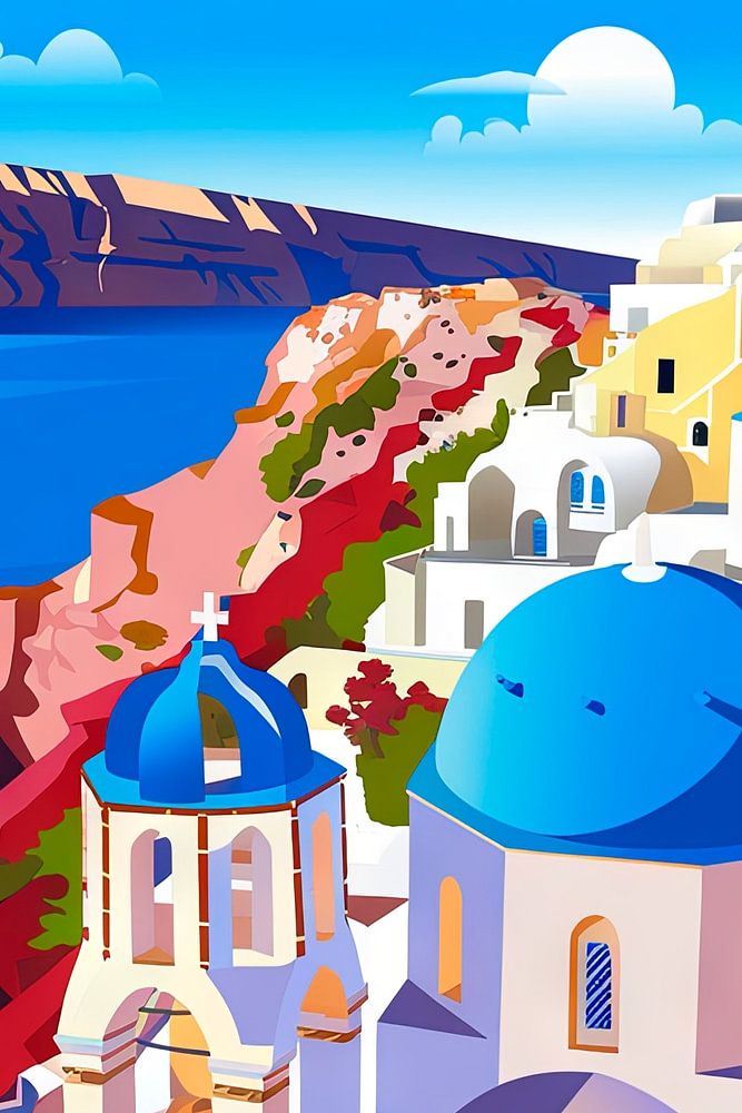 Sanft strahlt das azurblaue Wasser im Hintergrund, während strahlend weiße Häuser mit leuchtend blauen Kuppeln sich harmonisch an die Klippen klammern. Die malerische Küstenlinie von Santorini lädt ein zu träumerischen Spaziergängen, umgeben von strahlendem Sonnenschein und der unvergänglichen Griechischen Schönheit. Ein wahres Paradies, das Geschichte und Ruhe atmet.