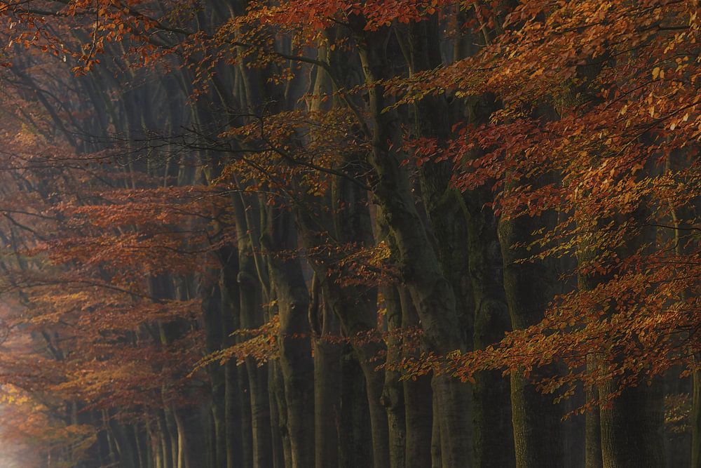ein schöner Morgen im Wald mit Nebel und schönen Herbstfarben. Wenn Sie die richtigen Wege kennen, können Sie tolle Fotos machen. Es ist wichtig, die Atmosphäre zu vermitteln, die Sie im Wald erleben. Ruhe, riesige Bäume und schönes Licht. Genießen Sie es in vollen Zügen.