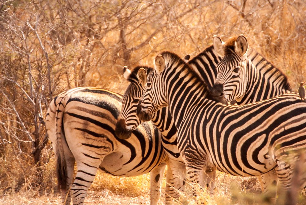 Wir trafen diese Zebrafamilie auf einer Safari in Südafrika. Die Komposition ist so schön, dass es ein Rätsel ist, wie viele Zebras es sind.