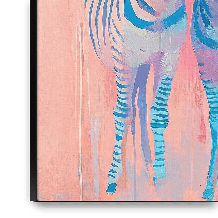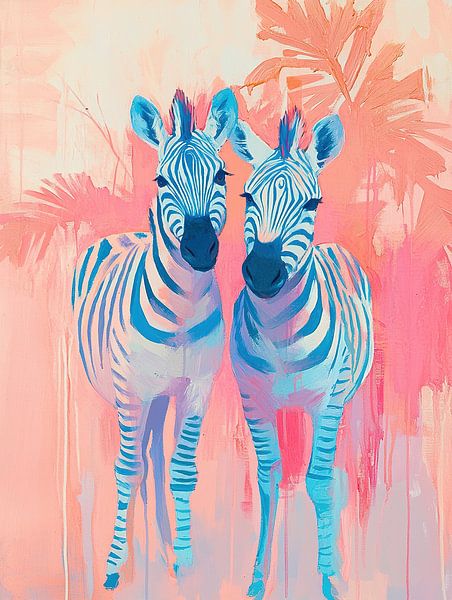 Zebra-'s Schilderij | Twee Zebra's met Kleurrijke Achtergrond - In dit schilderij zie je twee zebra's mit auffälligen schwarz-weißen Streifen vor einem Hintergrund aus sanften Rosa- und Blautönen, die eine fröhliche und sommerliche Atmosphäre schaffen. Details: Zebra, Gemälde, Sommer, fröhlich, rosa, blau, Tiere,…