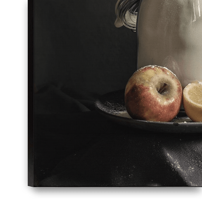 Gefällt Ihnen der Minimalismus? Dann ist dies ein schönes Stillleben für die Küche. Für dieses Stillleben habe ich Tageslicht verwendet, das von rechts in das Stillleben eintritt. Wenn Sie einen dunklen Hintergrund verwenden, wird Ihr Blick auf die Komposition mit Blume, Apfel und Zitrone gelenkt.