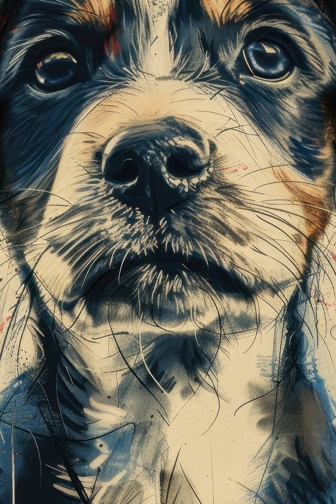 Stilisiertes Porträt eines Hundes mit einer Mischung aus Realismus und abstrakten Elementen. Mit naturgetreuen Details und abstrakten Hintergrundelementen. Mit dynamischen Markierungen und feineren Linien für Textur. Chinesische Tusche und Aquarell.