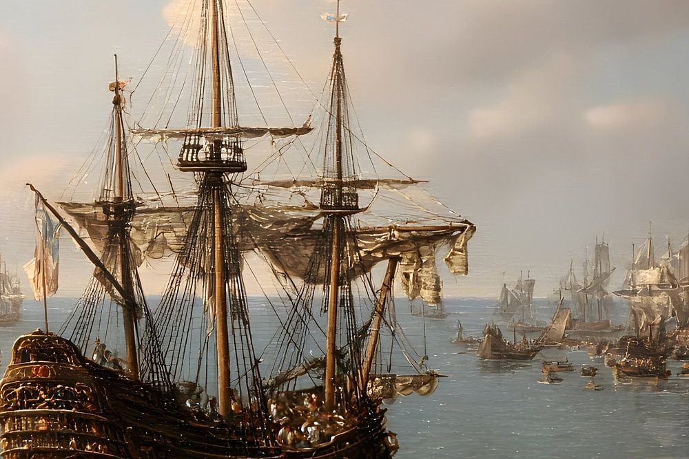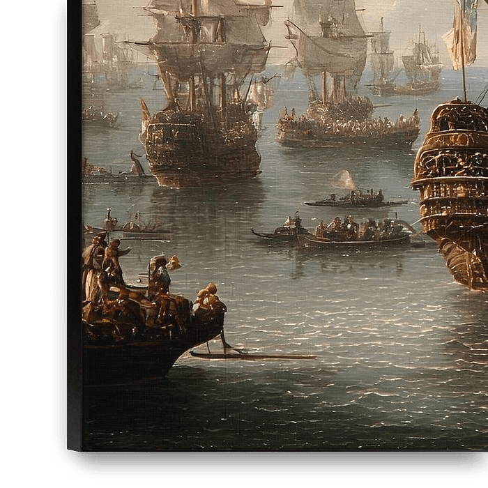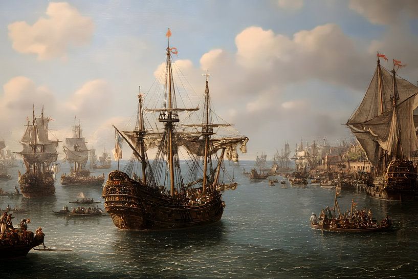 Das Bild zeigt eine historische Hafenszene mit zahlreichen großen Segelschiffen, Barkassen und Beibooten. Im Zentrum liegt ein reich verziertes Handelsschiff vor Anker, umgeben von reger Aktivität auf dem Wasser. Im Hintergrund erstreckt sich eine dicht bebaute Küstenstadt. Die Darstellung ist im Stil eines maritimen Gemäldes des…