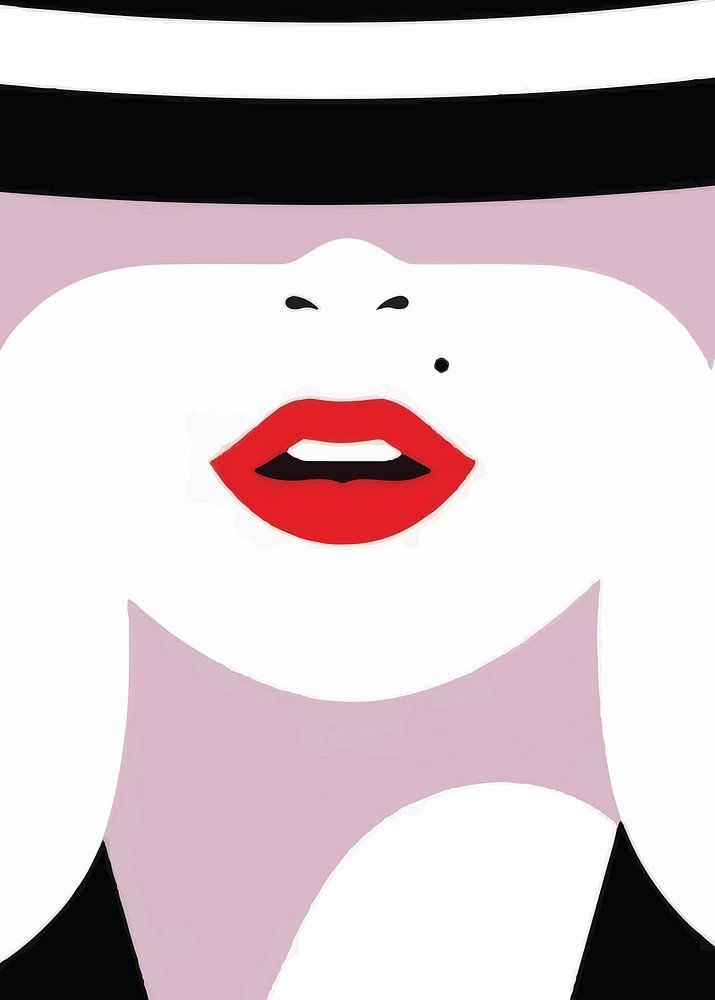 Ein minimalistisches und stilvolles Poster, das eine Frau mit einem auffälligen schwarz-weiß gestreiften Hut und auffallend roten Lippen zeigt. Dieses Kunstwerk strahlt Raffinesse und modernen Charme aus und eignet sich perfekt zur Verschönerung jedes Wohn-, Schlaf- oder Büroraums.