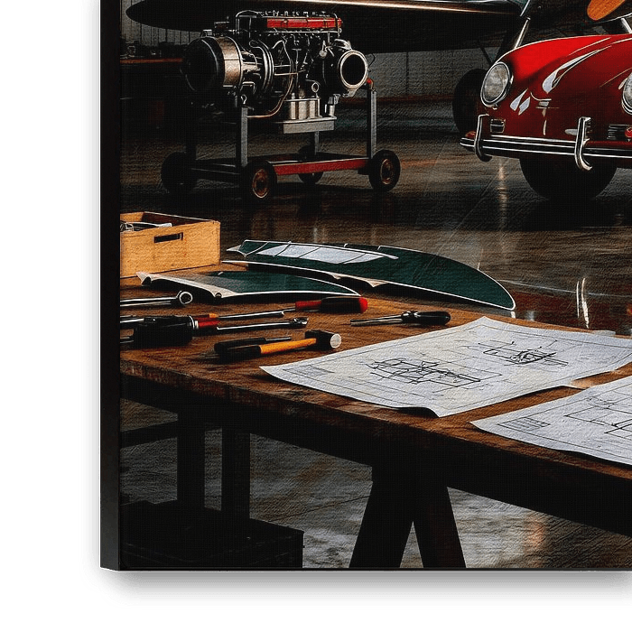 Um den Porsche herum befindet sich eine akribisch eingerichtete Werkstatt, ein Refugium für Kreativität und Restaurierung. Die hölzerne Werkbank, die mit Werkzeugen und Bauplänen übersät ist, zeugt von der praktischen Hingabe eines Handwerkers. Der Doppeldecker im Hintergrund mit seinem Holzpropeller und seinem Vintage-Charme ergänzt das Auto und schlägt eine Brücke zwischen den Welten der Luftfahrt und der Automobilkunst. Das Zusammenspiel von warmem Kunstlicht und sanftem natürlichem Licht, das durch die Fenster des Hangars fällt, schafft eine Stimmung der stillen Ehrfurcht.