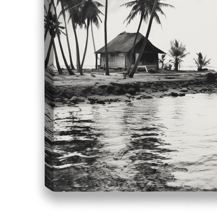 Dieses Kunstwerk zeigt eine klassische Darstellung eines tropischen Strandes in einer monochromen Farbpalette, wodurch es zeitlos und universell wirkt.