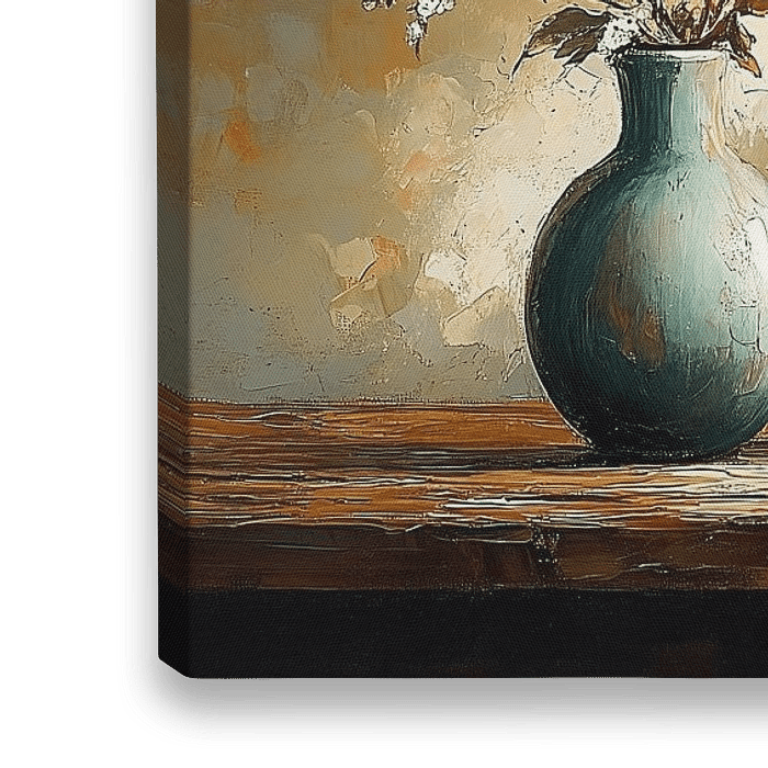 Dieses Kunstwerk strahlt eine ruhige Eleganz aus, wobei die zarten weißen Blüten einen schönen Kontrast zu den robusten türkisfarbenen Vasen bilden. Das weiche, warme Licht schafft eine ätherische Atmosphäre, während die strukturierten Pinselstriche der Komposition Tiefe und Leben verleihen. Die subtile Balance zwischen den organischen…