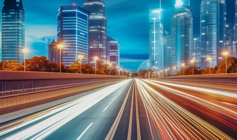 Zeitraffer-Autolichtspuren auf der nächtlichen Stadtstraße mit Skyline im Hintergrund