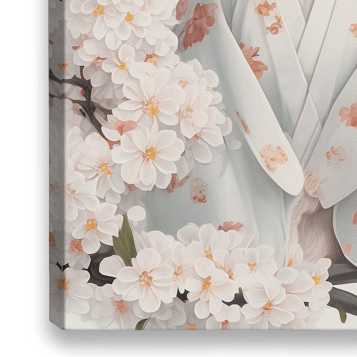 Fantasievolle Illustration einer süßen Katze in einem Kimono, umgeben von Sakura-Blüten. Mischtechnik in sanften Creme- und Lachstönen. Kunst mit einem Augenzwinkern ;-)