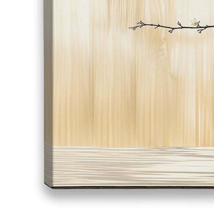 Dieses malerische Stillleben fängt die Essenz des Frühlings in einer ruhigen Komposition ein. Eine robuste Keramikvase mit warmem Farbton beherbergt anmutige Zweige voller zarter weißer Blüten. Der Hintergrund, ein subtiles Zusammenspiel aus sanftem Gold und Meeresgrün, schafft eine ätherische Atmosphäre, die die Frische der Jahreszeit…