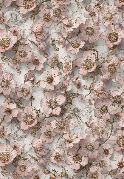 "A sophisticated fusion of traditional Japanese aesthetics and modern graphic luxury. This artwork features a delicate swarm of intricately detailed sakura blossoms, each adorned with complex Art Nouveau patterns. Floating gracefully over a polished Carrara marble background with subtle grey veins, the soft pink and gold-accented…