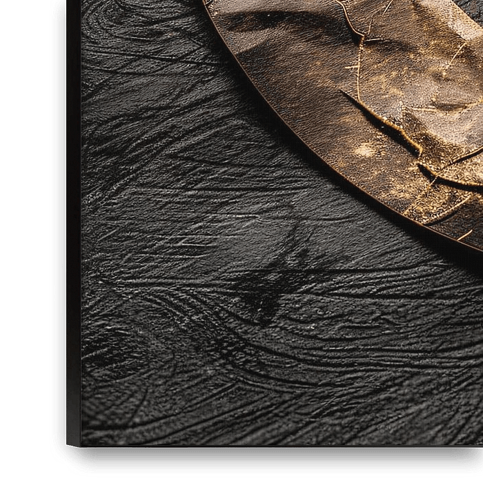 Dieses Stück stellt eine auffällige Komposition eines gebrochenen Kreises dar, der sorgfältig mit goldenen Adern ausgefüllt ist, die die Schönheit der Unvollkommenheit hervorheben. Die satten, dunklen Töne, gemischt mit dem luxuriösen Glanz des Goldes, bieten eine tiefe, kontemplative Erfahrung. Das abstrakte Design spielt mit Elementen…