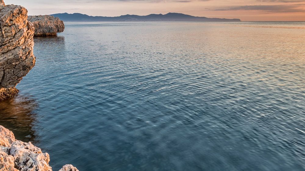Het zicht op de middellandse zee, van op een rost, bij zonsopopgang