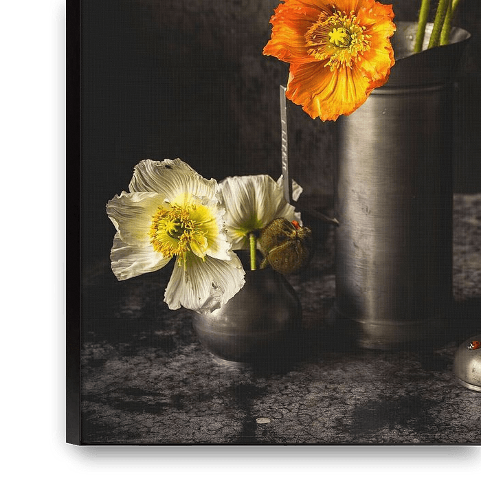 Bestelle dieses Stilleben Zinnkrug mit roten und orangefarbenen Mohnblumen oder Mohnblumen von Mevrouw KiekkieK als Reproduktion auf Leinwand, Alu-Dibond, als Poster, Fototapete oder Acrylglasbild.