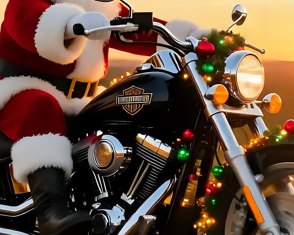 Santa Claus rast mit heiterem Gesichtsausdruck auf einem reich dekorierten Motorrad die verschneite Straße entlang. Sein knallroter Mantel flattert im Fahrtwind, weiße Pelzbesätze wirbeln feine Schneepartikel auf, und die Zipfelmütze sitzt fest, während bunte Lichterketten um den Lenker gewickelt in einem warmen Rhythmus blinken. Das Motorrad ist festlich geschmückt mit Tannenzweigen, goldenen Kugeln, Lametta und einer kleinen Girlande; an der Soziusseite baumelt ein prall gefüllter Sack mit bunt verpackten Geschenken, dessen Papier im Scheinwerferlicht schimmert. Der Motor brummt tief und überraschend gemütlich, ein vertrauter Ton, der die stille Winternacht durchschneidet und Kinder neugierig an die Fenster lockt. Hinter dem Gefährt zieht sich eine funkelnde Spur aus angeschüttetem Schnee und glitzernden Flocken, als hätte der Himmel selbst Konfetti gestreut. Straßenlaternen werfen lange, tanzende Schatten, die mit dem Flackern der Weihnachtsbeleuchtung verschmelzen und eine fast filmische Stimmung erzeugen. Gelegentlich hebt Santa die Hand zum Gruß oder wirft ein schelmisches Zwinkern in Richtung überraschter Passanten; Lachen und erstaunte Rufe folgen ihm wie ein Chor. Der Himmel darüber zeigt erste Sterne, und die Luft riecht nach Tannenharz und warmem Karamell. Diese Szene vereint Tempo und Wärme, Tradition und Abenteuerlust: Santa auf zwei Rädern bringt die festliche Magie direkt in die Gassen, ein flüchtiger, aber unvergesslicher Augenblick voller Freude und Vorfreude auf die Bescherung.