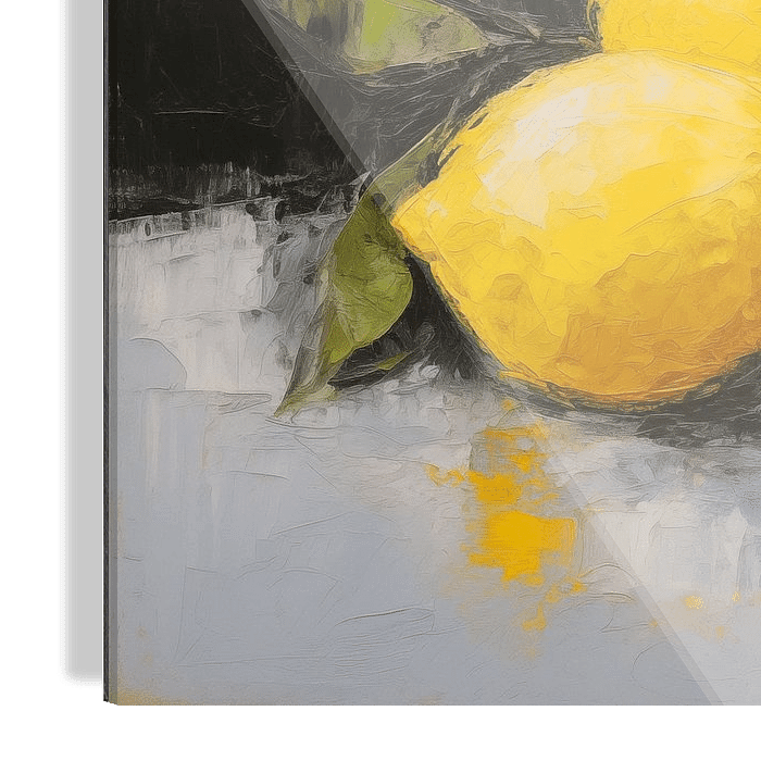 Stilleben mit Zitronen in überwiegend gelben und grauen Tönen.