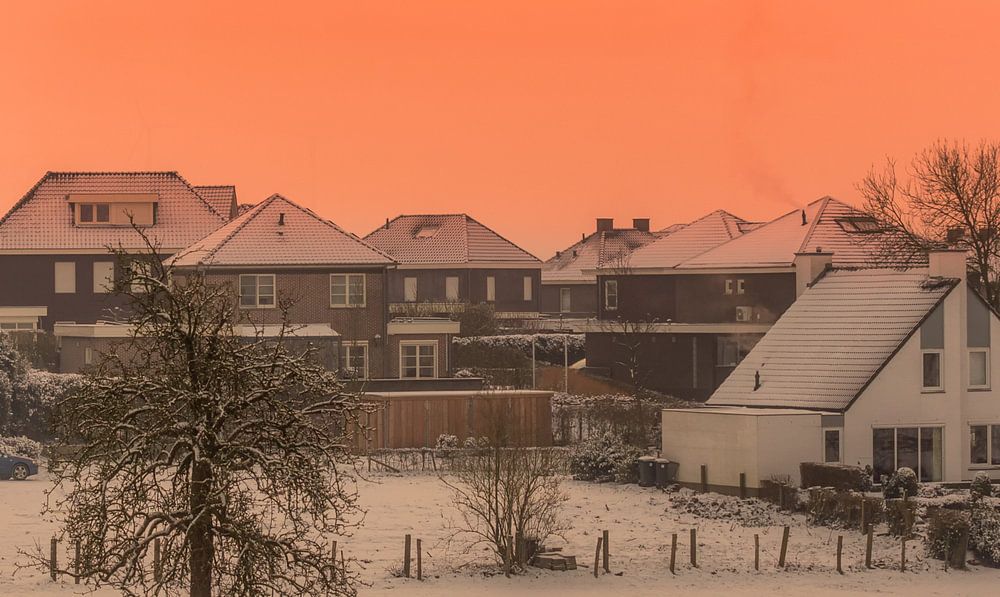 Zonsopkomst boven Simpelveld dat bedekt is met een laagje sneeuw
