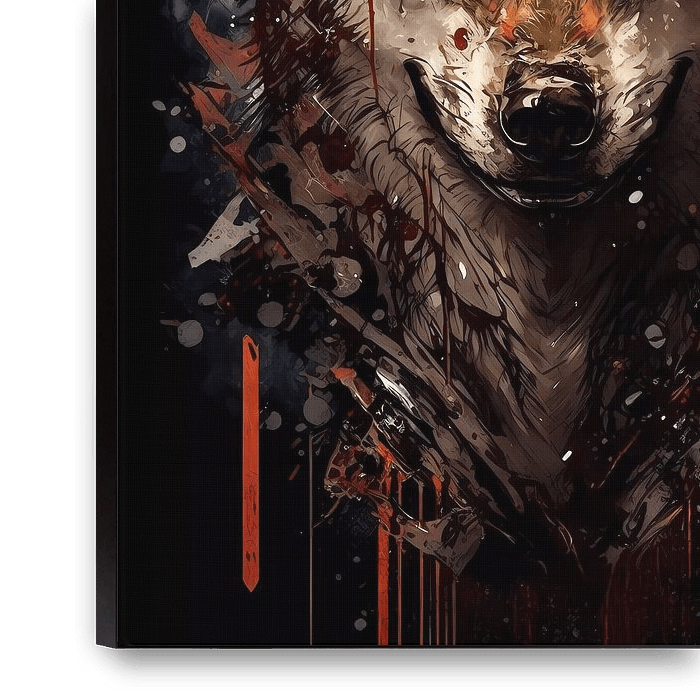 "Raging Spirit" ist ein Kunstwerk, das die unbezwingbare Kraft der Natur und den wilden Geist des Wolfes einfängt. Der Wolf blickt direkt in die Kamera und wirkt wütend, umgeben von rot-orangenen Farbspritzern, die die feurige Intensität seiner Gefühle widerspiegeln. Die weißen Punkte und der schwarze Hintergrund erzeugen ein…