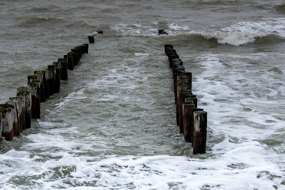 Impression von Strand und Meer in Zoutelande auf Walcheren in Zeeland. Tosende See, weiße Schaumkronen, dunkler Himmel mit Sonnenuntergang. Die hölzernen Wellenbrecher ragen knapp über das Wasser hinaus. Die Flut ist hoch und der Wind pocht gegen das Ufer und treibt das Wasser hoch. Es ist herrlich, mit dem Wind im Gesicht auf das Meer hinauszuschauen und die Wellen zu genießen. Es ist Dezember, an der Schwelle zu Silvester. Sturm Gerrit ist gerade vorbeigezogen, und mit Henk steht der nächste Sturm auf dem Programm. Die See ist immer noch kabbelig und das Wasser steht höher als normal. Es wird einige Zeit dauern, bis sich die Lage wieder beruhigt. Aber es gibt nichts Schöneres als die wilde Kraft des Wassers, und es ist wunderbar, sie zu erleben. Schließlich zieht das Meer immer wieder an, und auch jetzt ist es schön zu beobachten, wie es am Strand tobt und wie sich Farben und Muster immer wieder verändern.