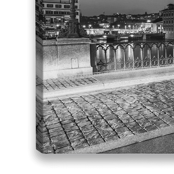 Schwarzweißfotografie Münsterbrücke über die Limmat, Limmatquai und Grossmünster in der Altstadt von Zürich am Abend, Kanton Zürich, Schweiz
