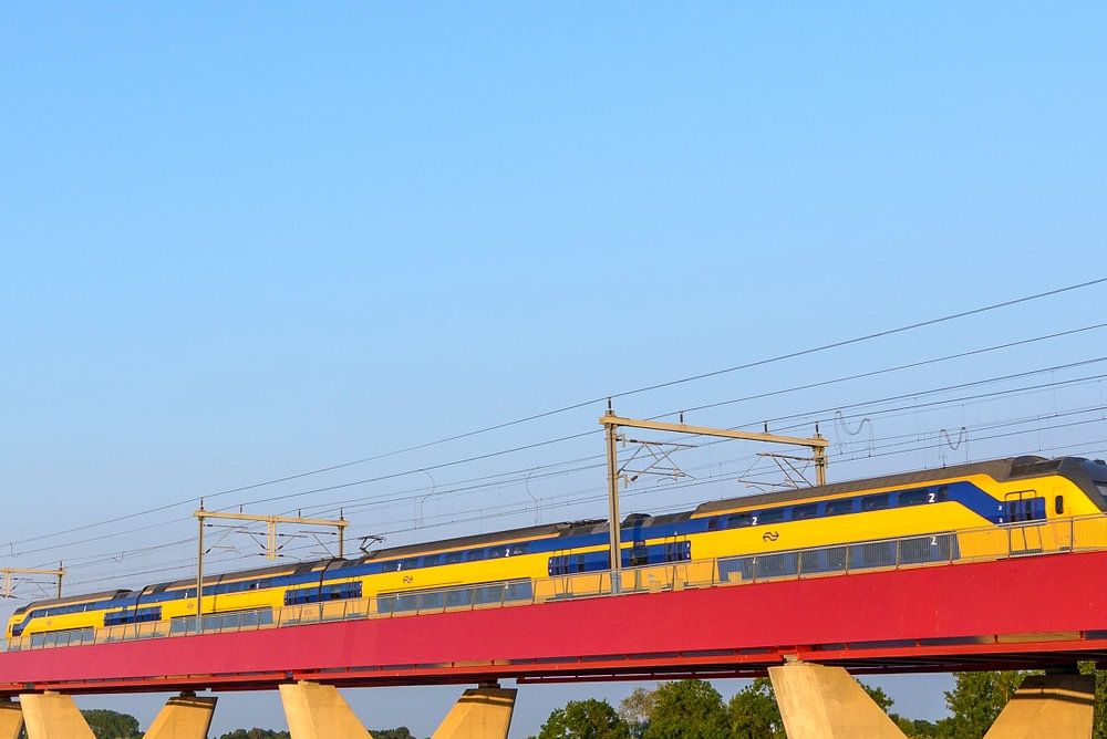 Intercity-Zug der niederländischen Bahn NS bei der Fahrt über die Hanzeboog-Zugbrücke über den Fluss IJssel in der Nähe der Stadt Zwolle und der Stadt Hattem.