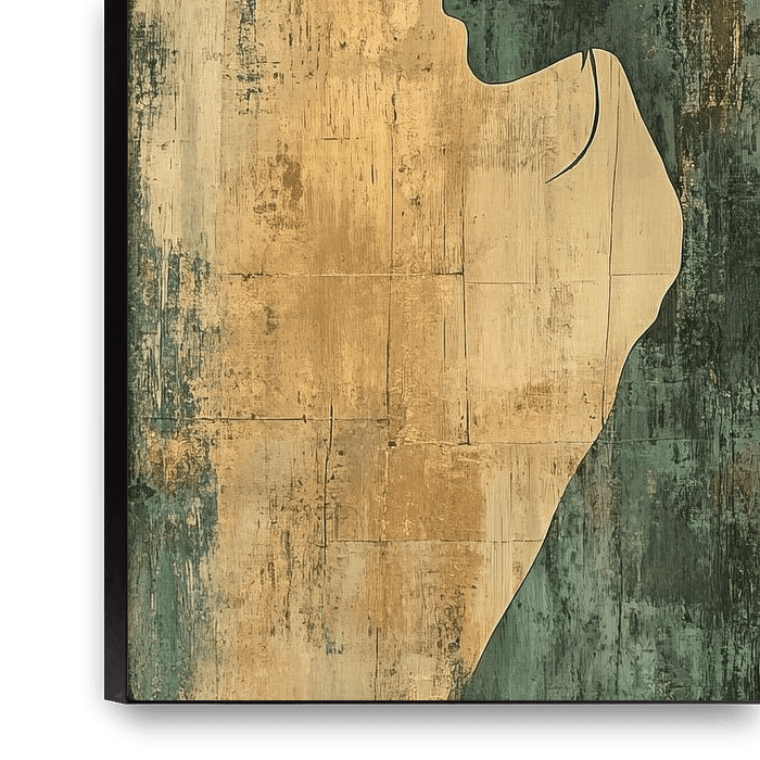 Gedämpfte Frau mit Blumen - Dies ist eine Frau Gemälde: eine Silhouette in Seitenansicht einer Frau mit Blumen in ihrem Haar, als eine moderne abstrakte Malerei mit verwitterten Textur und gedämpften beige und gold Erdtönen und einem dunklen grünen füllen ausgeführt - Frau Malerei, Malerei Frau.