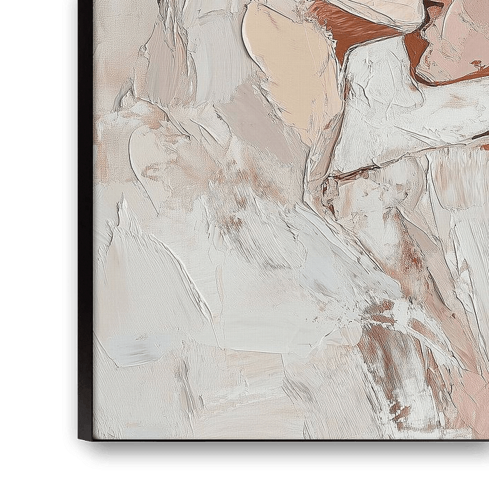 Die weichen Hauttöne und die warmen Akzente von Rot, Rosa und Orange betonen die Wärme und Zerbrechlichkeit der Umarmung, während die weißen und beigefarbenen Töne ein Gefühl der Reinheit und Stille hervorrufen. Die Textur der Farbe - dick und fühlbar - verstärkt den Eindruck, dass man diesen Moment nicht nur sehen, sondern auch fühlen kann.