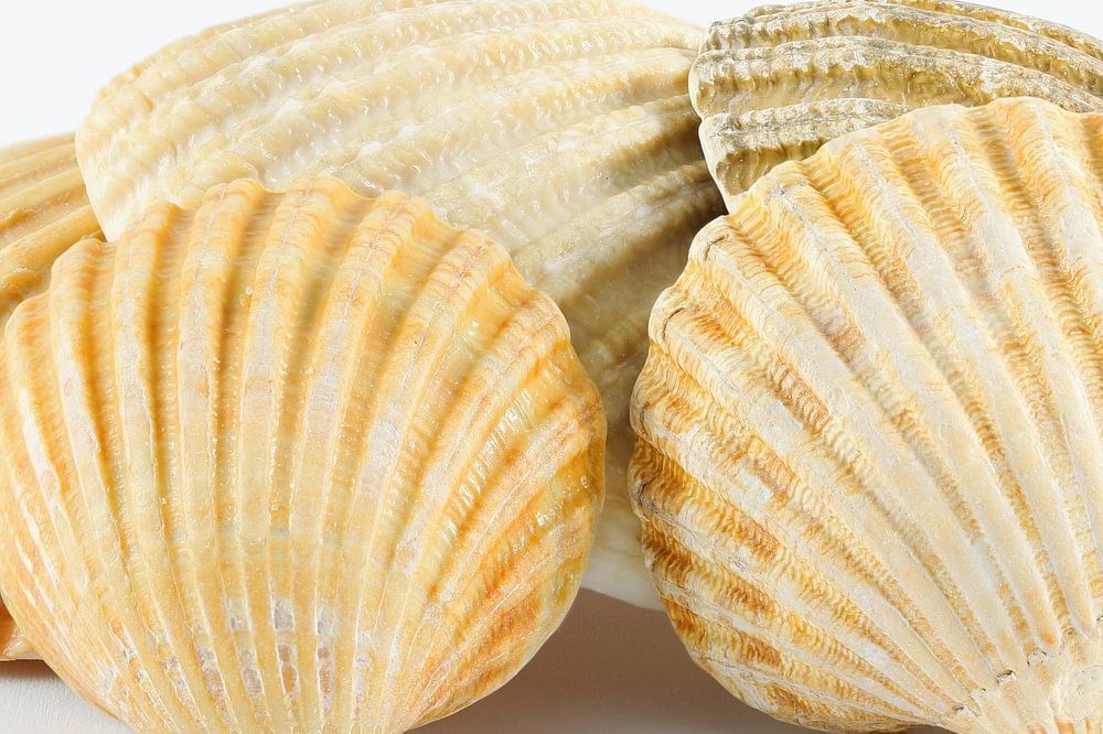 Ein Stillleben mit fünf Muscheln, die in der Bretagne und der Normandie (Frankreich) gefunden wurden. Die Muscheln sind verschiedenfarbig. Die Kontraste zwischen den Texturen und Farben der Muscheln heben sich schön von der hellen Umgebung ab.