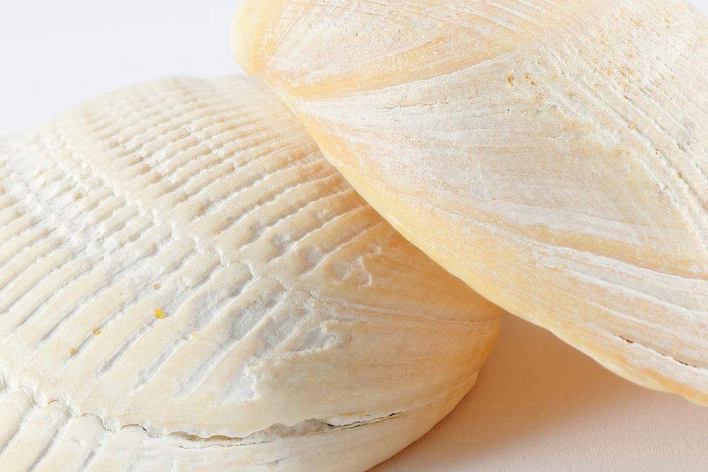 Ein Stillleben mit zwei Muscheln, die in der Bretagne und der Normandie (Frankreich) gefunden wurden. Die Muscheln sind verschiedenfarbig. Die Kontraste zwischen den Texturen und Farben der Muscheln heben sich schön von der hellen Umgebung ab.