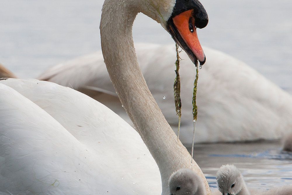 Deze zwanenfamilie met jongen was heerlijk aan het genieten van de groene wieren uit de sloot.
