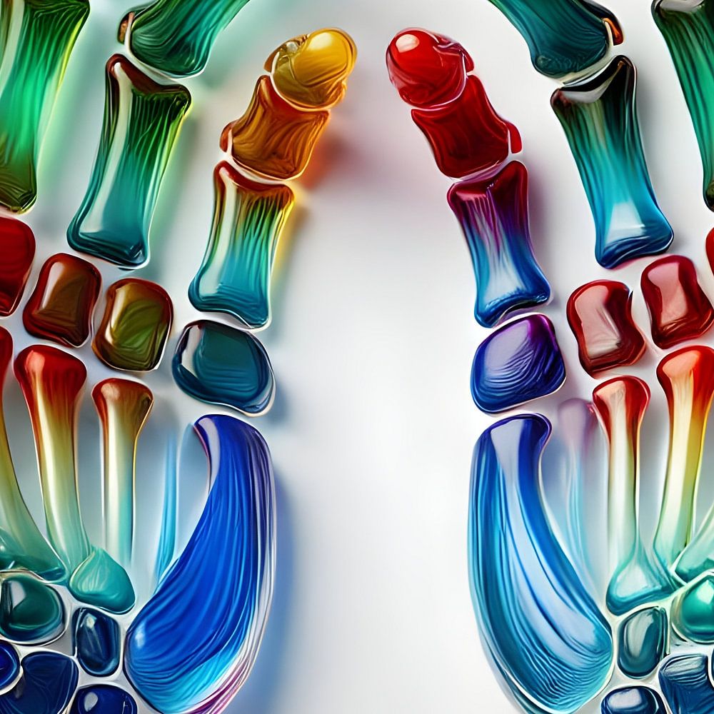 Dieses Kunstwerk zeigt zwei Hände, die in einem abstrakten, farbenfrohen Stil dargestellt sind, in dem Knochenstrukturen sichtbar sind. Die Knochen sind aus transparentem und farbigem Glas gefertigt.