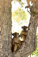 Zwei lustige Paviane sitzen in einem Baum in der Wildnis des Moremi Nationalparks in Botswana, Afrika.