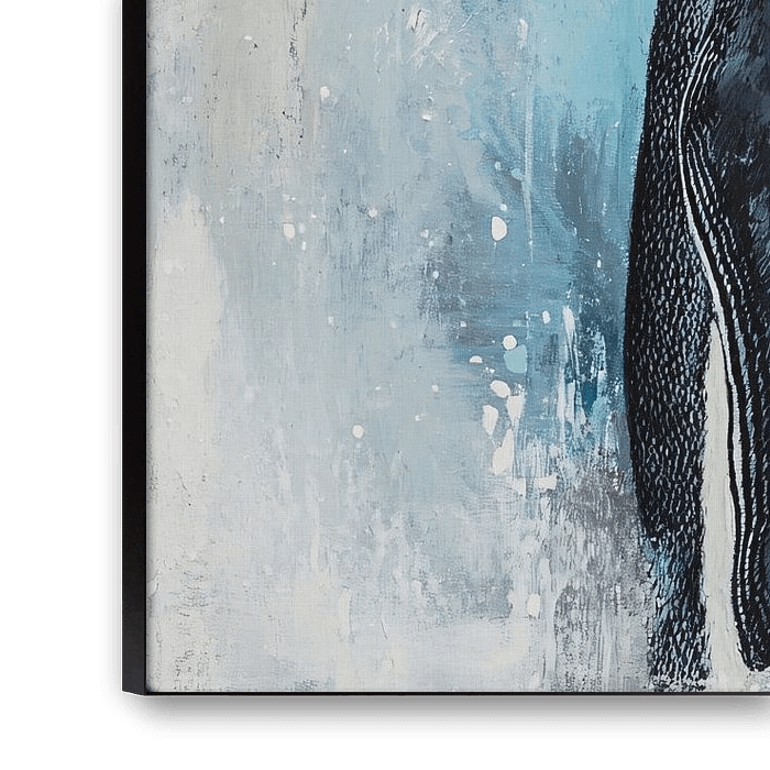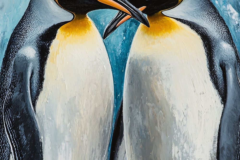 Diese wunderschöne künstlerische Darstellung zeigt zwei Kaiserpinguine in einer intimen und zärtlichen Pose, perfekt eingefangen vor einem dezent eisblauen Hintergrund. Das Design strahlt Wärme und Verbundenheit aus, trotz der kühlen Farbpalette. Die Mischung aus leuchtenden gelben Akzenten in Kombination mit dem sanften Weiß und Schwarz der Pinguine schafft ein beeindruckendes visuelles Gleichgewicht. Dieses Kunstwerk ist ideal, um ein modernes Interieur aufzuhellen oder einen Hauch von natürlicher Eleganz zu verleihen. Es ist sowohl für Tier- als auch für Kunstliebhaber geeignet und bietet sowohl Ruhe als auch Inspiration. Hängen Sie dieses Gemälde in Ihrem Wohnzimmer oder Büro auf und bringen Sie die Schönheit der Natur in Ihren Raum!