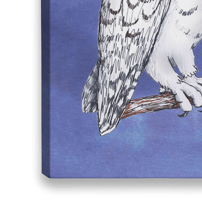 Eine fineliner Zeichnung von zwei niedlichen schneebedeckten Eulen, die bequem nebeneinander sitzen. Der Hintergrund besteht aus tiefblauer Aquarellfarbe, diese wurde digital hinzugefügt.