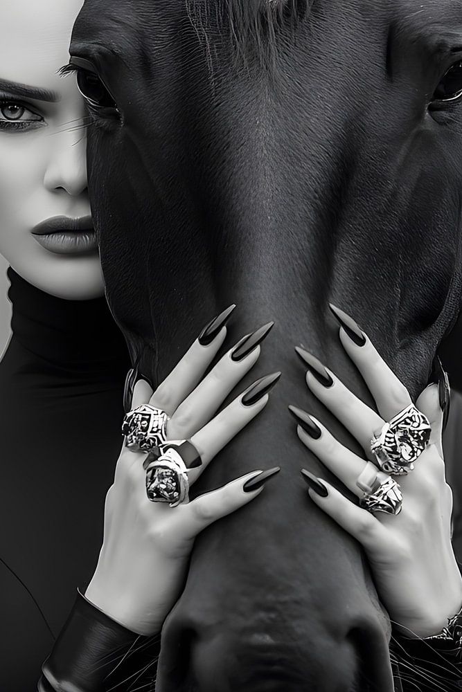 Ein kontrastreiches Schwarzweiß-Porträt zeigt eine elegante Frau in minimalistischer, dunkler Kleidung, die eng an den Kopf eines Pferdes geschmiegt ist. Ihre Hände, geschmückt mit markantem Schmuck und langen Nägeln, umfassen sanft das Pferdegesicht. Mensch und Tier verschmelzen visuell zu einer symmetrischen, ikonischen…