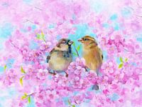Zwei Spatzen im blühenden Kirschbaum von Karen Kaspar