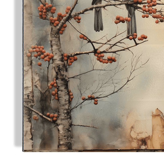Ein Werk mit zwei Vögeln auf einem Zweig mit orangefarbenen und roten Beeren.