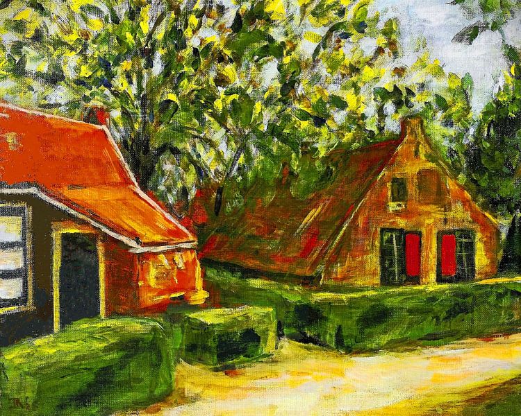Bestelle diese Malerei Zwei alte Bauernhäuser. von Ineke de Rijk als Reproduktion auf Leinwand, Alu-Dibond, als Poster, Fototapete oder Acrylglasbild.