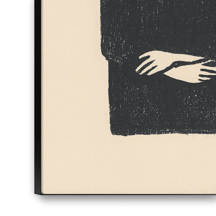 Ein minimalistisches Schwarzweiß-Kunstwerk zeigt ein Paar in inniger Umarmung. Der Mann auf der linken Seite lehnt seinen Kopf sanft zur Frau, während seine Arme ihre Schultern halten. Die Frau neigt leicht ihr Haupt, die Augen geschlossen, in ruhiger Nähe. Die Figuren sind in klaren Linien und solidem Schwarz auf hellem Beigeton dargestellt, mit subtiler Textur in Kleidung und Konturen. Die zentrale Komposition und der starke Kontrast betonen die emotionale Verbindung und Intimität des Moments. Ein reduziertes, symbolisches Werk über Nähe, Ruhe und Zweisamkeit.