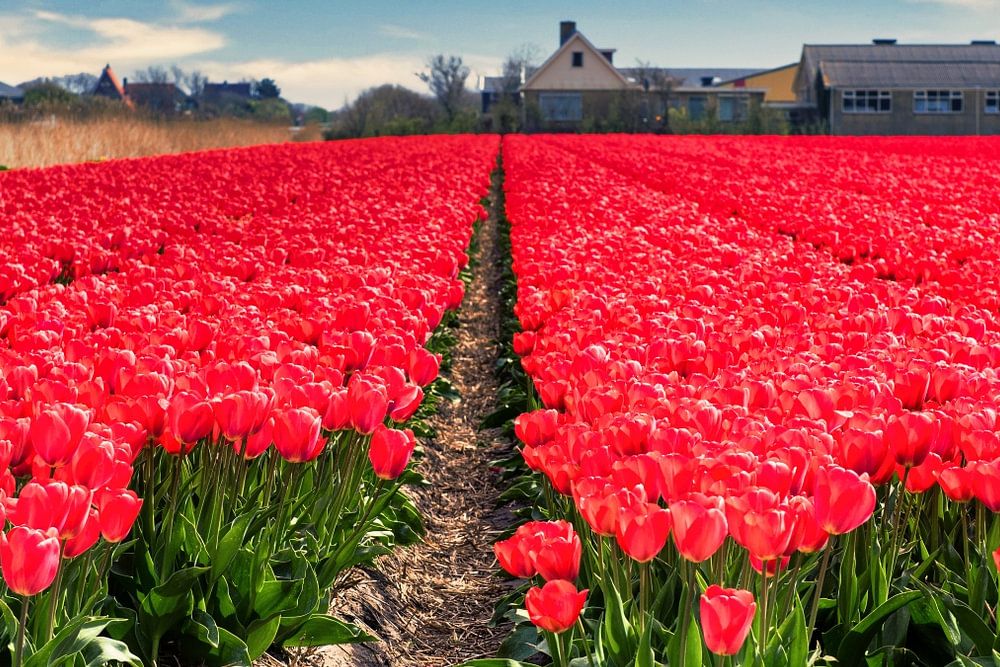 Zwiebelfeld mit roten Tulpen unter einem holländischen Himmel.